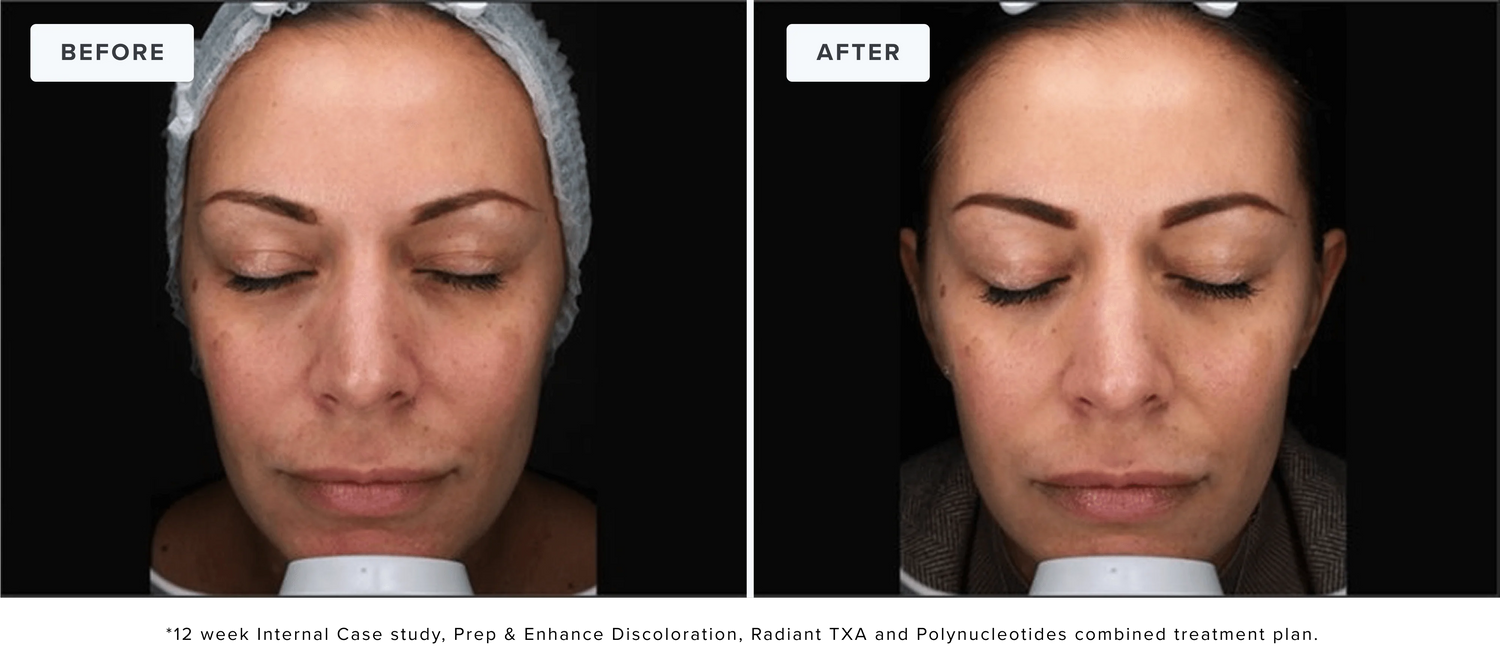 All about targeting discolouration, our newest peel is powered by Tranexamic Acid (TXA) in an AHA blend. It works to brighten the skin and even out skin tone, which can help to improve skin clarity.